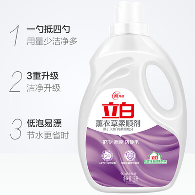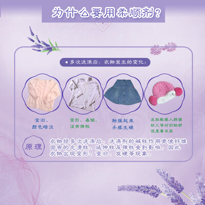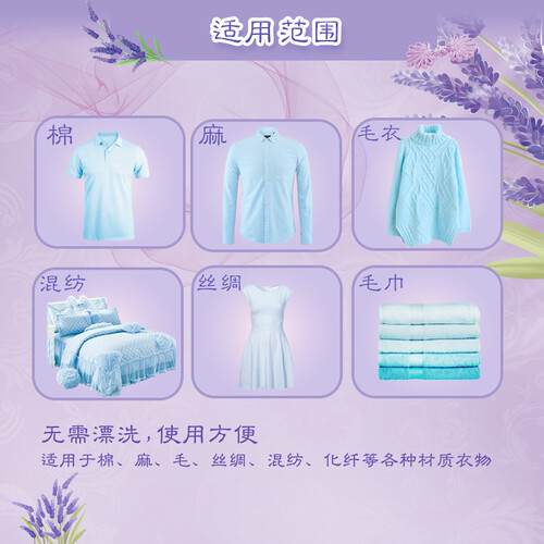 蕴含天然植物成分柔顺剂,细致呵护衣物,防止衣物变形显旧,令衣物蓬松绵柔。淡雅的薰衣草香味,清香怡人,不刺鼻。