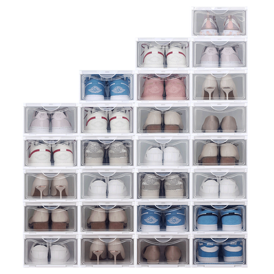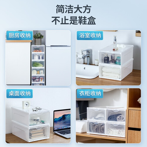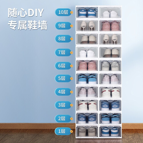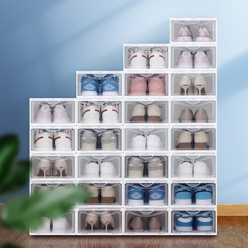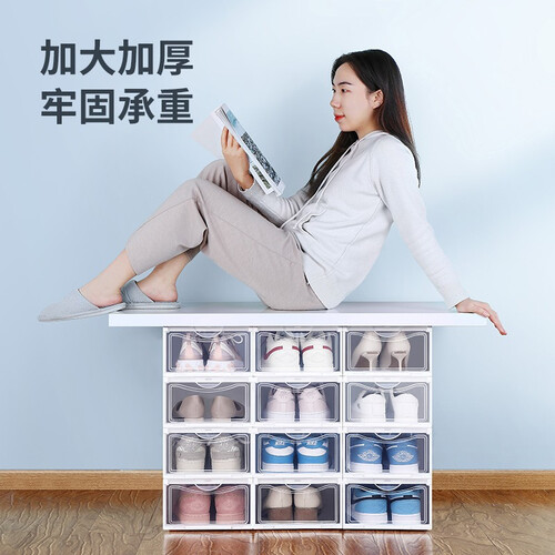 顶部和底座采用卡槽连接,稳固结实,即使倾斜55度也不会倒塌,摆放整齐有序。质地透明,看得清楚,一眼就能发现要找的鞋子在哪里。