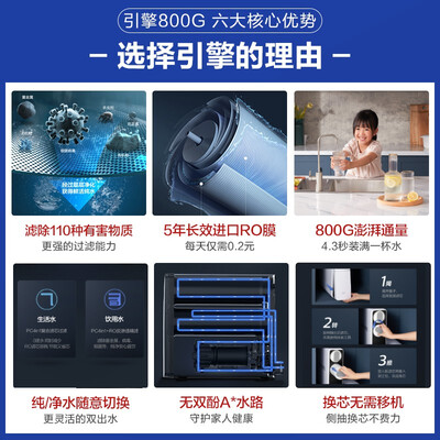 两种滤芯五重过滤,有效过滤110种有害物质。通过权威机构检测,采用反渗透膜片,滤芯升级延长使用时间,持续保护用水健康。