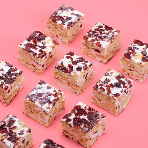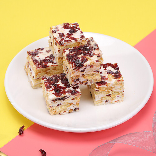 精选蛋清液、小麦粉和蔓越莓干为原料,烘焙成口感香酥软糯、酸甜可口的雪花酥。独立小包装,方便卫生,好吃不脏手。