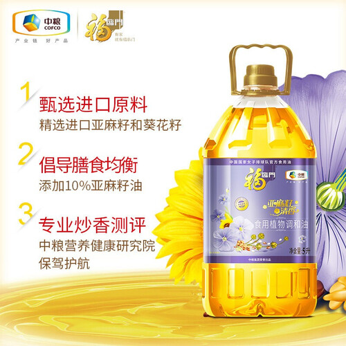 福临门压榨食用油精选优质亚麻籽、葵花籽压榨,风味清新,适合煎炒烹炸,做出的菜肴清淡适口,为菜肴增添健康味道。