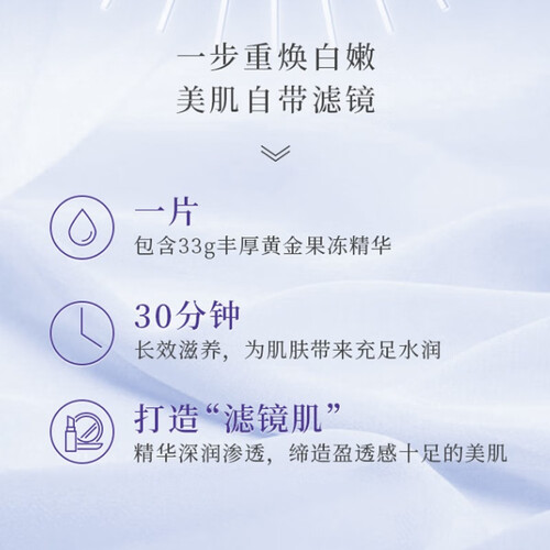 集补水、美白、修护多效合一的滋养面膜,它添加角鲨烷、氨基酸及神经酰胺等成分,呈丰厚果冻质地,上脸清爽舒适,四季皆可使用!