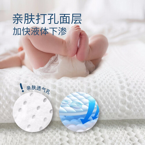 采用亲肤打孔面层,液体加速下渗,让宝宝屁股保持干净清爽。选用透气芯体,在使用的不容易堆积尿液,让宝宝舒适自在。