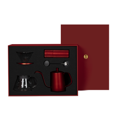 功能齐全,带磨豆机、手冲壶、温度计等,让你一次使用更便捷;喜庆红色外观,适合自用或送亲友。
