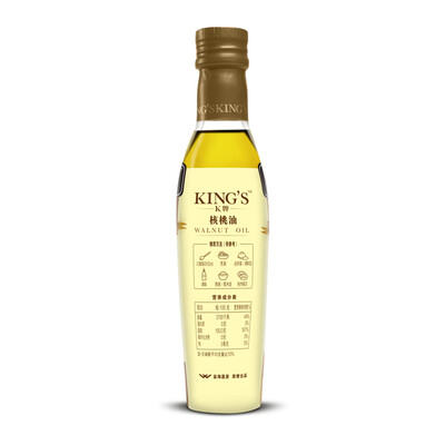 KING'S核桃油亚油酸含量达60%以上,亚麻酸含量达10%,头道初榨,色泽金黄,口感清爽,原汁原味独特核桃芳香。