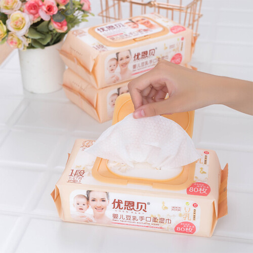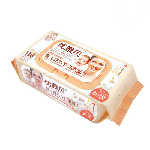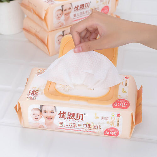湿巾厚实柔软,PH值呈弱酸性,同时还特别添加食品级豆乳精华,口感微甜不涩,适用宝宝手、口清洁。