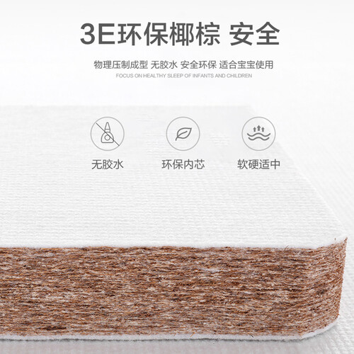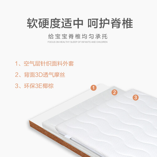 优选针织棉面料,亲肤透气,舒适保暖,用心呵护宝宝健康睡眠。环保3E椰棕,软硬度适中,给宝宝脊椎均匀承托。