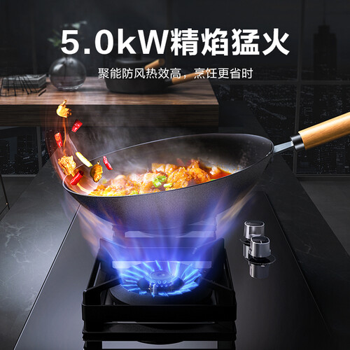 优质钢化玻璃材质制作的燃气灶面板,健康环保时尚美观同时不易沾油污,使用后更便于清洁。5.0KW大火力,轻松驾驭中式爆炒。
