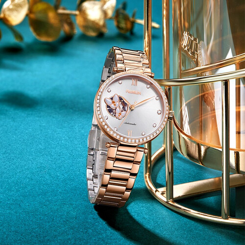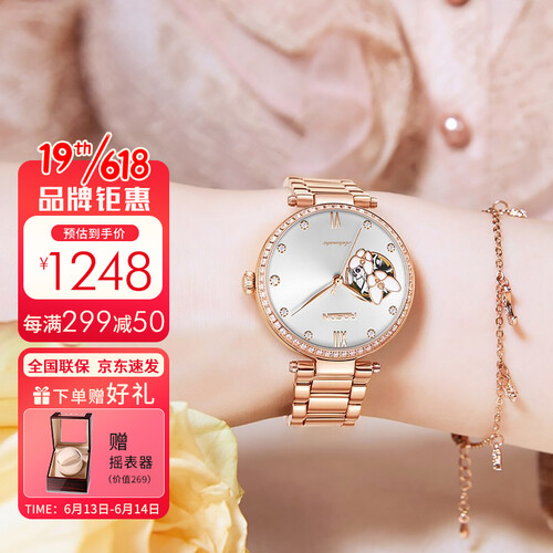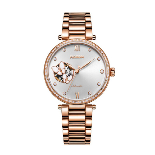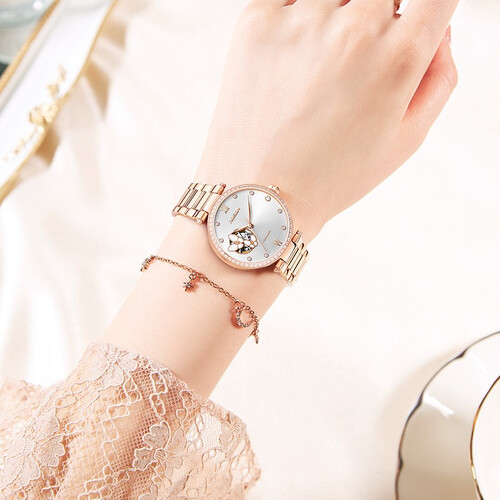 视野开阔的圆形表盘,周边58颗锆石镶嵌,流光溢彩更夺目。盘面做了蝴蝶镂空设计,栩栩如生,散发出温婉气息。