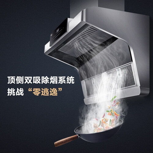 采用顶侧双吸设计,紧锁升腾油烟,防止油烟逃窜,紧锁油烟不跑烟。两侧翼板与机身形成有效拢烟腔,有效避免油烟逃窜。