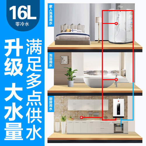 具备16L大水量,出水快速流畅,可满足全家接力洗浴的需求。搭配零冷水科技,花洒打开就可输出热水,实现即开即洗。