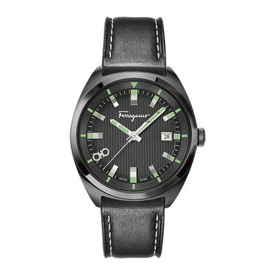 黑色垂直条纹雕饰纹图案,结合品牌首字母浮雕表冠,饱含质感与内涵,轻松搭配出高街范。夜光时标与指针,夜视也能轻松读时。