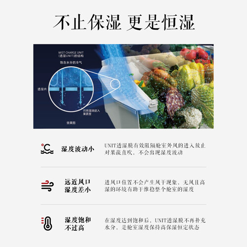 内置UNIT透湿膜,只将湿润送入果蔬室,透湿不透风,打造更适宜的环境;双冷却系统,提供精细化分储空间,食材养鲜不串味。