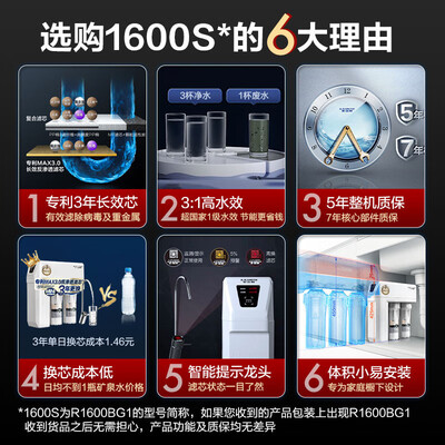 使用MAX3.0长效反渗透滤芯专利技术,3年才换一次滤芯,使用更省心。拥有1.6升/分钟澎湃出水量,不会因为制水慢的问题烦恼。