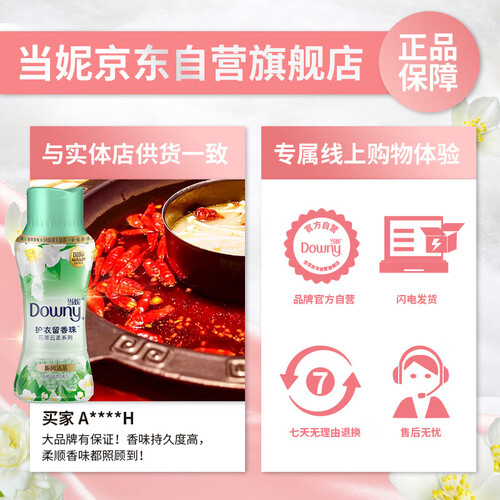 一瓶含留香珠和柔顺珠,令洗后的衣物不仅散发怡人花香,而且触感柔软顺滑,堪称洗衣好伴侣;并能持久留香,助吃货告别烧烤异味。