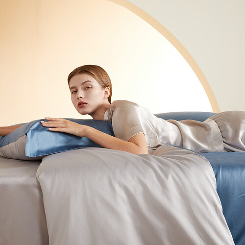 采用100S双股贡缎面料,纱线细腻纤薄,面料温厚融实,丝滑柔醇。运用丝绸工艺织造,使面料具有丝般光泽感,更添高级质感。