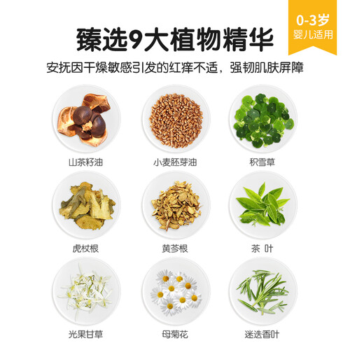 专为婴儿研制,富含小麦胚芽萃取精华,温和润泽婴儿娇嫩肌。臻选9大植物精华,安抚紧绷干燥肌,缓解红痒不适问题。