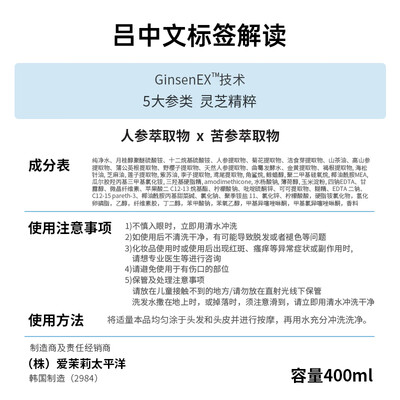 韩国进口洗发水款式,品牌实力保障,使用安心放心,不易对头皮产生危害损伤。含有人参提取物,能为发芯注入营养,修复受损发质。