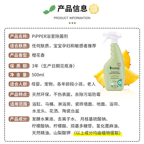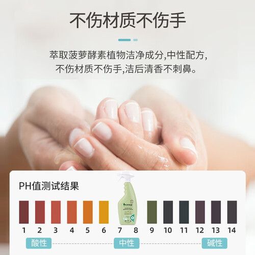 萃取菠萝酵素成分,中性配方,温和抑菌不伤手。良好的除垢力,能轻松搞定浴室的水垢、皂垢等。芳香气味,同时更清新环境。