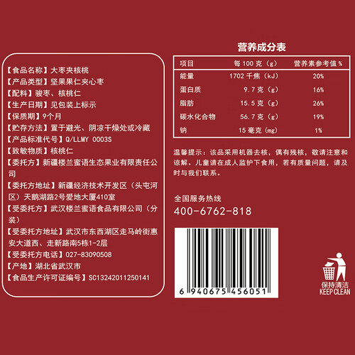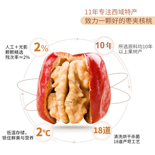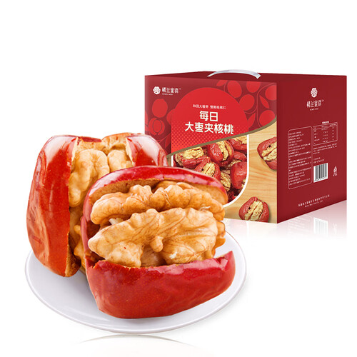 大枣里面夹有整颗核桃,入口很有嚼劲,甜甜的口感中香味浓厚。配方比例高,含有充足营养,一口就可体验双重口感。