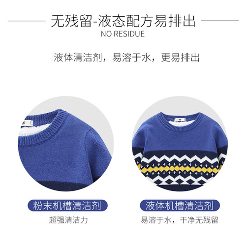 采用活性剂瓦解污垢,无腐蚀成分,延长洗衣机使用寿命,使用更加安心;液体清洁剂易溶于水,排出更加方便。