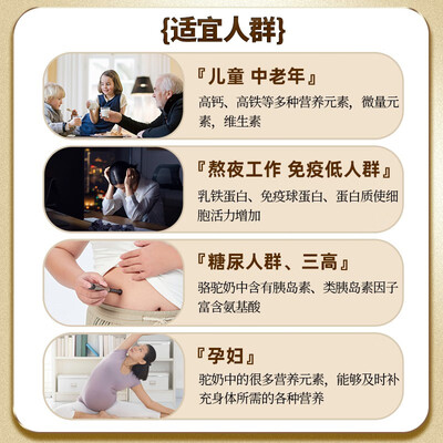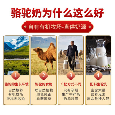 高品质牧场优质骆驼乳为原料,内含丰富营养,优质乳蛋白成分,给予爸妈更好的营养;口感纯正,自然醇香,符合老年人口味。