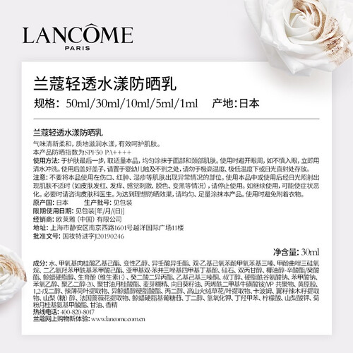 兰蔻小白管,给予肌肤高倍的防晒力,抵御肌肤光老化,轻盈的乳液质地,保湿更养肤,打造清透好肤感,顺滑跟妆,一支搞定。