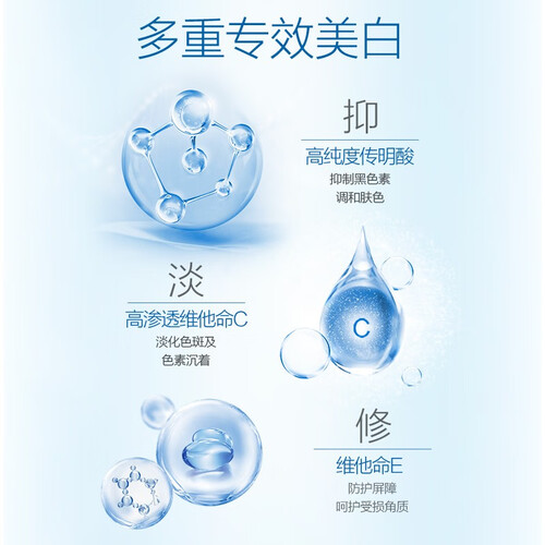 萃取了透明质酸、VE的精华,有效的补水滋润,从肌底焕发的光泽感,减少色素沉着,拯救肌肤暗沉,焕发白皙透亮。