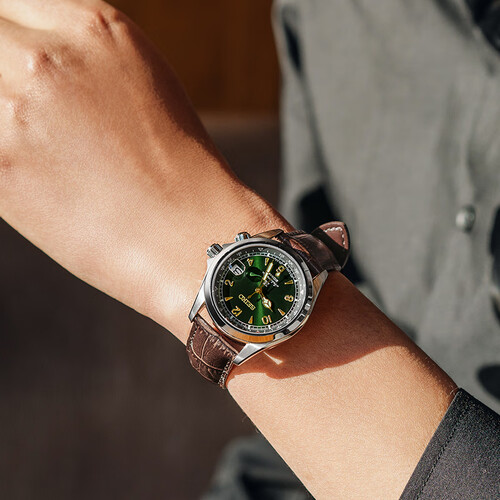 绿色盘面设计,焕发着渐变光晕,视觉清新又复古。棕色皮革表带,柔软透气,佩戴起来十分舒适,还能体现男性的稳重气质。