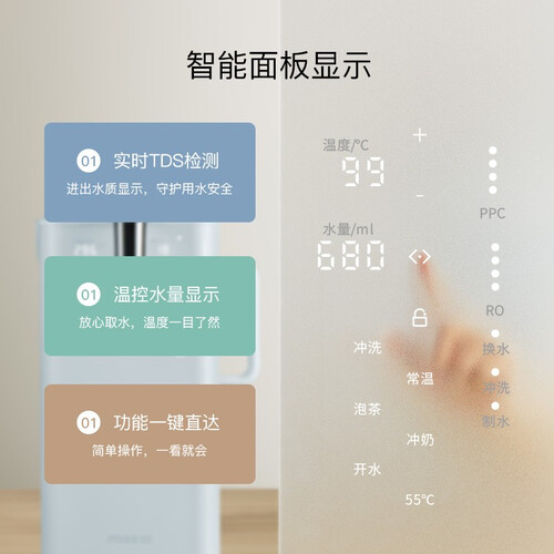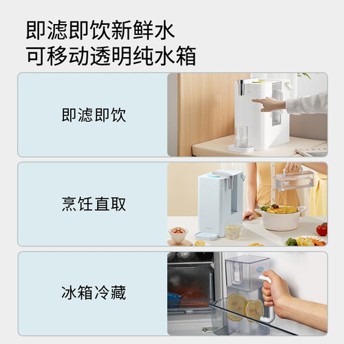 台上式免安装的净水器,90°旋转出口专利设计,摆放随意不占空间;3秒速热,拒绝反复加热,避免千滚水,现烧现喝更安全。