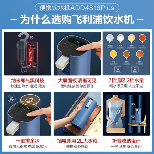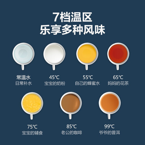 采用厚膜加热技术,3秒即热,热水不用久等。机身小巧容易携带,旅途中也能随时提供鲜活热水。7挡水温调节,方便冲泡不同饮品。