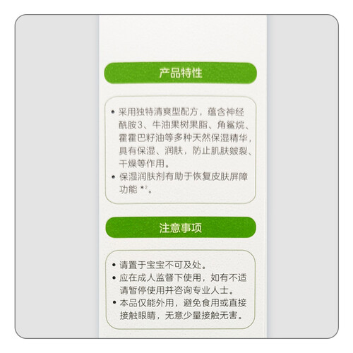 含有角鲨烷成分,亲肤贴合,可以修护宝宝受损的皮肤,焕发光泽弹性。质地清爽易推开,渗透性出色,效果更显著。