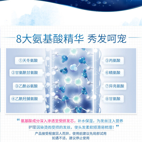 8大氨基酸美容液复合配方,可以直接吸附在头发和头皮上,具有高保湿力,从而达到保持滋润,可以有效修复头发受损部分。