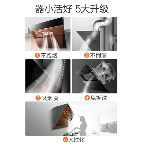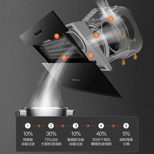 采用5重油烟分离系统,快速溶解内部油污,更方便清洗,保持机器良好性能。铜合金火盖有效增加受热面积,提升做饭效率。