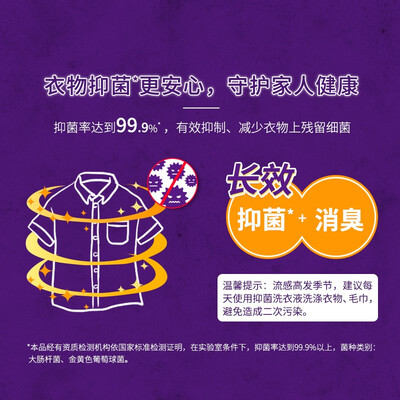 拥有深层洁净力的同时还有很好的抑制细菌作用,可有效消除衣物吸附细菌,长效呵护衣物健康。低泡成分,易清洗不残留。