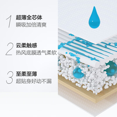 新一代酷薄芯体,穿上轻薄无束缚,透气不易漏尿。热风底膜轻柔透气,有效减少闷热感,放心接触肌肤。