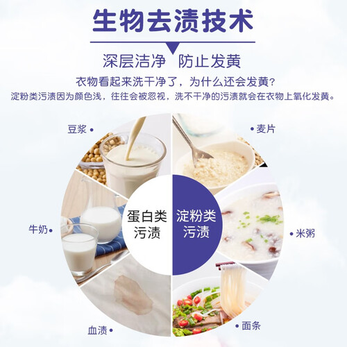 不含荧光剂,带来强大洁净力,去除污渍异味,不惧残留。浓缩天然祛渍的成分,可以快速的脏污,还衣物洁净。