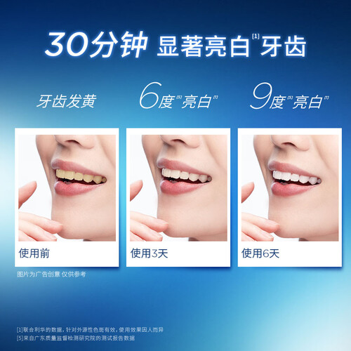 添加了进口CP精华,并以3D浸透式深入牙缝,包裹牙齿,多方位亮白牙齿。具有密集亮白效果,30分钟即可有效果。