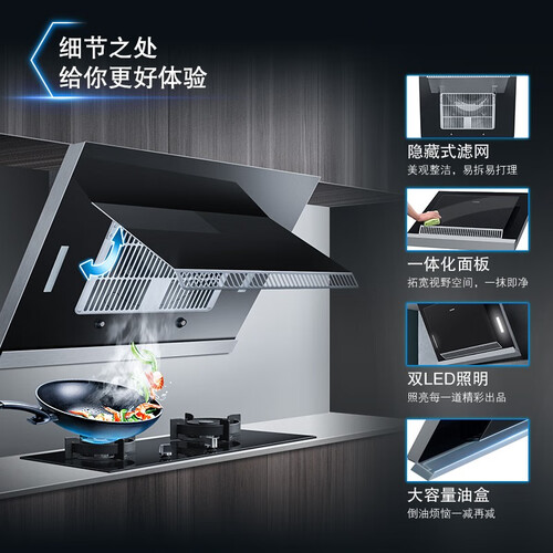 通过加热电机均匀熔化油脂,智能自清洁效果强,采用四面进风设计,快速排走烟油味,精致巧妙的设计,能驾驭多种户型。
