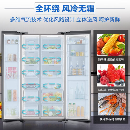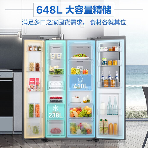 拥有648L大容量存储空间,满足家庭日常囤货需求,食材各自就位。金属匀冷面板,制冷均匀、迅速,食材储鲜表现出色。