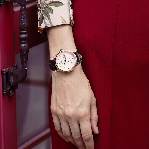 PVD镀金表盘耐看不俗气,装饰于腕间凸显女性魅力。鳄鱼纹皮质表带纹理紧密,设计感十足,满足多种场合穿搭。