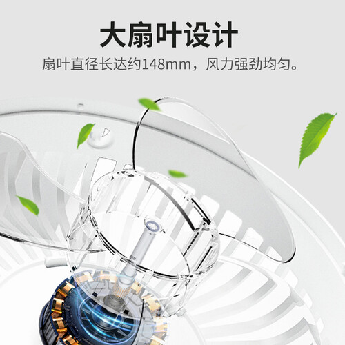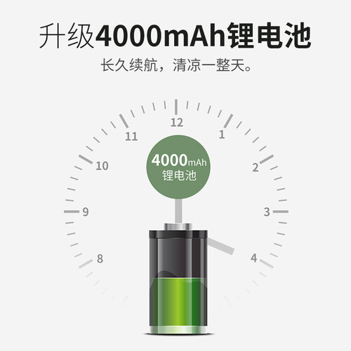 大直径扇叶设计,可提供均匀强劲的风力,清凉舒适,缓解炎热。大容量锂电池升级,续航给力,持久凉爽。