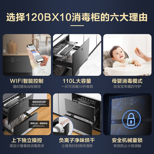 消毒烘干存放功能集于一体,实用性佳。特设母婴消毒程序,通过物理方式去除餐具细菌,安全无化学物质,守护宝宝用餐健康。