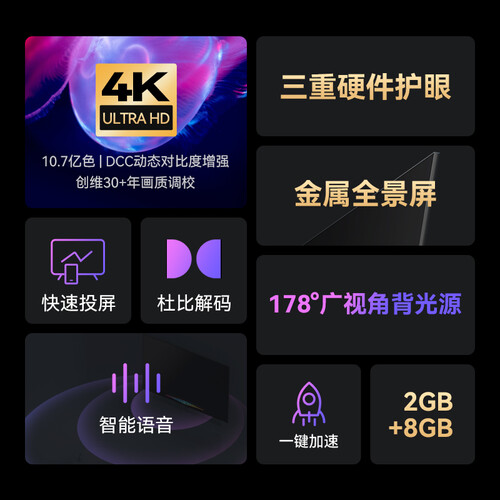 内置智能远场语音3.0系统,不需要遥控器也能轻松操控电视,解放双手更省心。采用新一代金属全面屏,大屏观影更畅快。