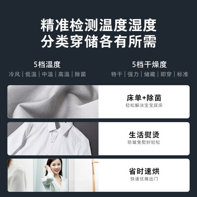 双层滤毛屑,劲风快速去除残留的灰尘等物质,穿衣更健康卫生。准确检测温湿度,针对性地控温,烘衣更充分有效率。