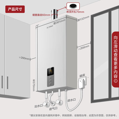 宽裕调节的设计,满足全家人都会不同水温的需求,使用更加方便。自带防倒风装置,有效防止水箱冻裂,安全防护使用更省心。