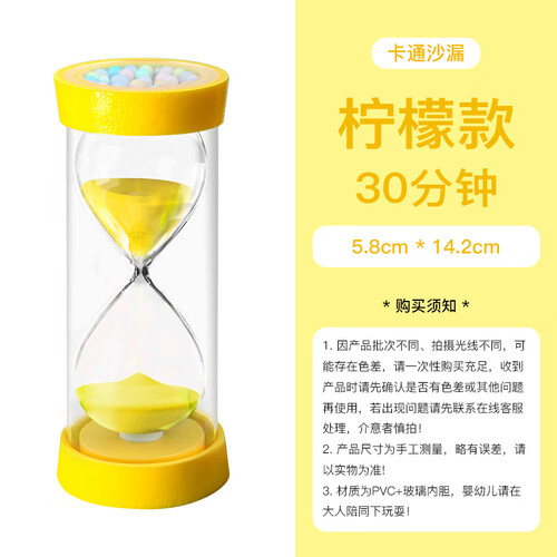 水果造型设计的沙漏,顶部与底部仿照柠檬设计,给人可爱童趣的感觉。而且材质具有耐摔的优势,意外掉落后不易破损,可长久使用。