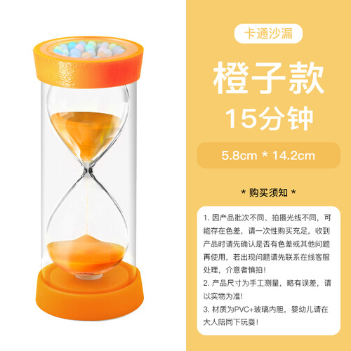 萌趣可爱的水果造型,让沙漏变得更有趣味,放在家中也能成为一道靓丽的风景线。一次漏完为15分钟,可帮孩子养成时间观念。