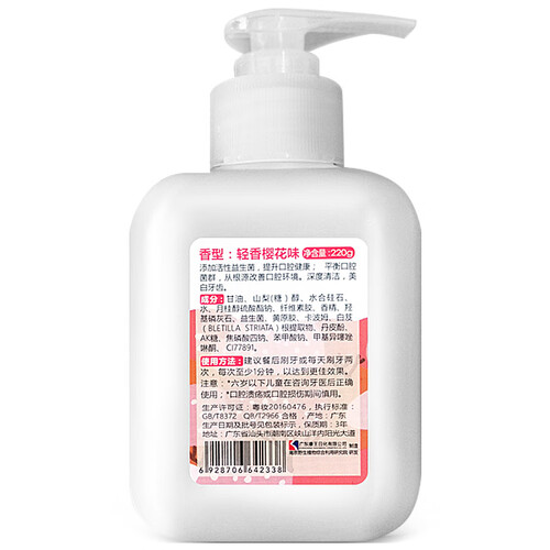 益生菌能够平衡口腔菌群减少牙菌斑滋生,协同白芨根、丹皮酚等中草药提取物,有效清火营养牙龈,轻香樱花口味唤醒一天好心情。