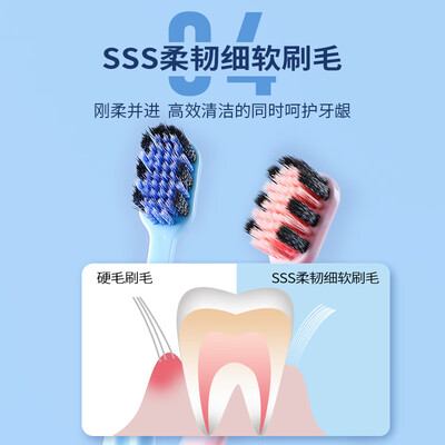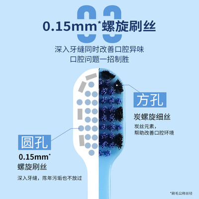 特含的备长炭元素,能够帮助改善口腔异味,保持清新舒适。细密的螺旋刷丝,深入清洁齿缝,达到去除牙渍的效果。